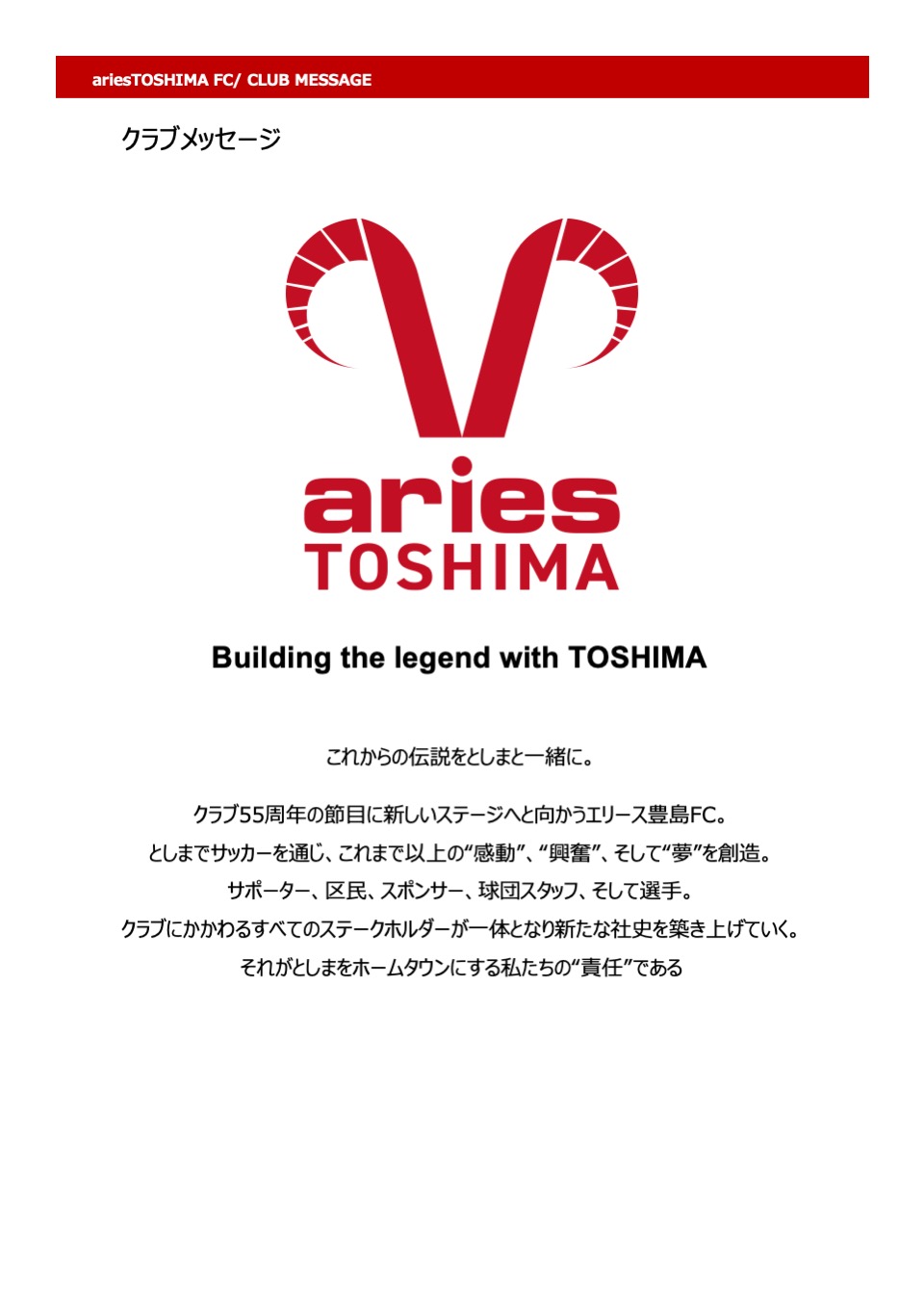 としまでサッカーを通じ、これまで以上の“感動”、“興奮”、そして“夢”を創造。